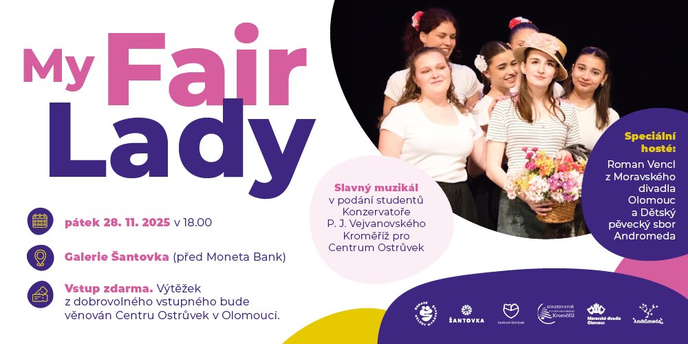 Pátek, 28. listopadu 2025 od 18.00 hodin. Přijďte v pátek 28. listopadu zažít slavný muzikál My Fair Lady v podání studentů Konzervatoře P. J. Vejvanovského v Kroměříži! Tentokrát však v úplně netradičním prostředí – přímo v Galerii Šantovka v Olomouci! Představení začíná v 18:00 hodin v přízemí, v prostoru před prodejnou H&M.